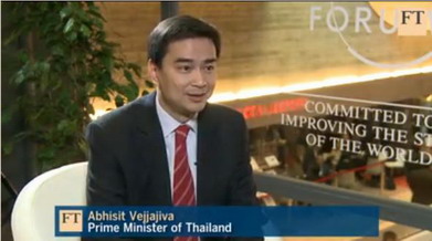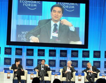 2. นายกรัฐมนตรีเข้าร่วมเป็นผู้อภิปรายในหัวข้อ “A Social Contract for the 21st Century” โดย อภิปรายถึงสภาพสังคมปัจจุบันที่ประชาชนดำรงชีวิตในความเสี่ยงของวิกฤต เศรษฐกิจ อาหารและพลังงาน ในขณะที่กระจายรายได้ขาดความเท่าเทียม อันนำมาซึ่งการขาดความเชื่อใจต่อรัฐบาลว่าจะสามารถสร้างความเจริญเติบโตและ ความมั่นคงในชีวิต หรือการพังทลายของสัญญาประชาคม (social contract) ในรูปแบบเดิม โดยนายกรัฐมนตรีได้แสดงความเห็นว่า ประเทศกำลังพัฒนากำลังสร้างสัญญาประชาคมของตนเอง ซึ่งมีรัฐและประชาชนเป็นหุ้นส่วนระหว่างกัน รัฐไม่ใช่ผู้สร้างความมั่งคั่งของประเทศแต่เป็นภาคเอกชน ดังนั้น รัฐจึงมีหน้าที่สร้างโอกาสให้ประชาชนสามารถเข้าถึงการเจริญเติบโต โดยการสร้าง