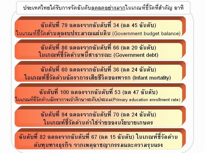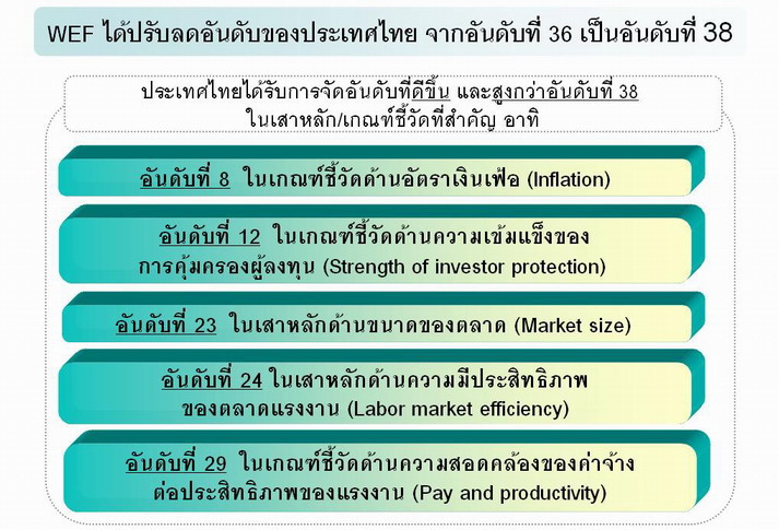 2. คณะ รัฐมนตรีมีมติ เมื่อวันที่ 7 ธันวาคม 2553 มอบหมายให้ สศช. เป็นหน่วยงานเจ้าภาพหลักในการรวบรวมและบูรณาการข้อมูลต่างๆที่เกี่ยวข้อง สำหรับการจัดอันดับของประเทศไทย ที่จะให้แก่ WEF ในเดือนพฤษภาคม-มิถุนายนของทุกปี เพื่อเป็นข้อมูลเปรียบเทียบอ้างอิงกับข้อมูลของ WEF โดย ให้กระทรวงการต่างประเทศเป็นหน่วยงานสนับสนุนและประสานงาน เพื่อการดังกล่าว และรับทราบและเห็นชอบตามมติคณะกรรมการรัฐมนตรีเศรษฐกิจ (มีมติเมื่อ 22 พฤศจิกายน 2553) ที่เสนอให้กระทรวงการต่างประเทศดำเนินการในส่วนของการปรับปรุงกระบวนการ ประสานกับ WEF ในแง่ของข้อมูลและการเข้าถึงภาคธุรกิจ รวมถึงความเป็นไปได้ในการเสนอให้ WEF พิจารณาเพิ่มผู้ประสานงานในประเทศไทยที่เป็นผู้แทนจากภาคเอกชน อาทิ สภาหอการค้าแห่งประเทศไทย และสภาอุตสาหกรรมแห่งประเทศไทย